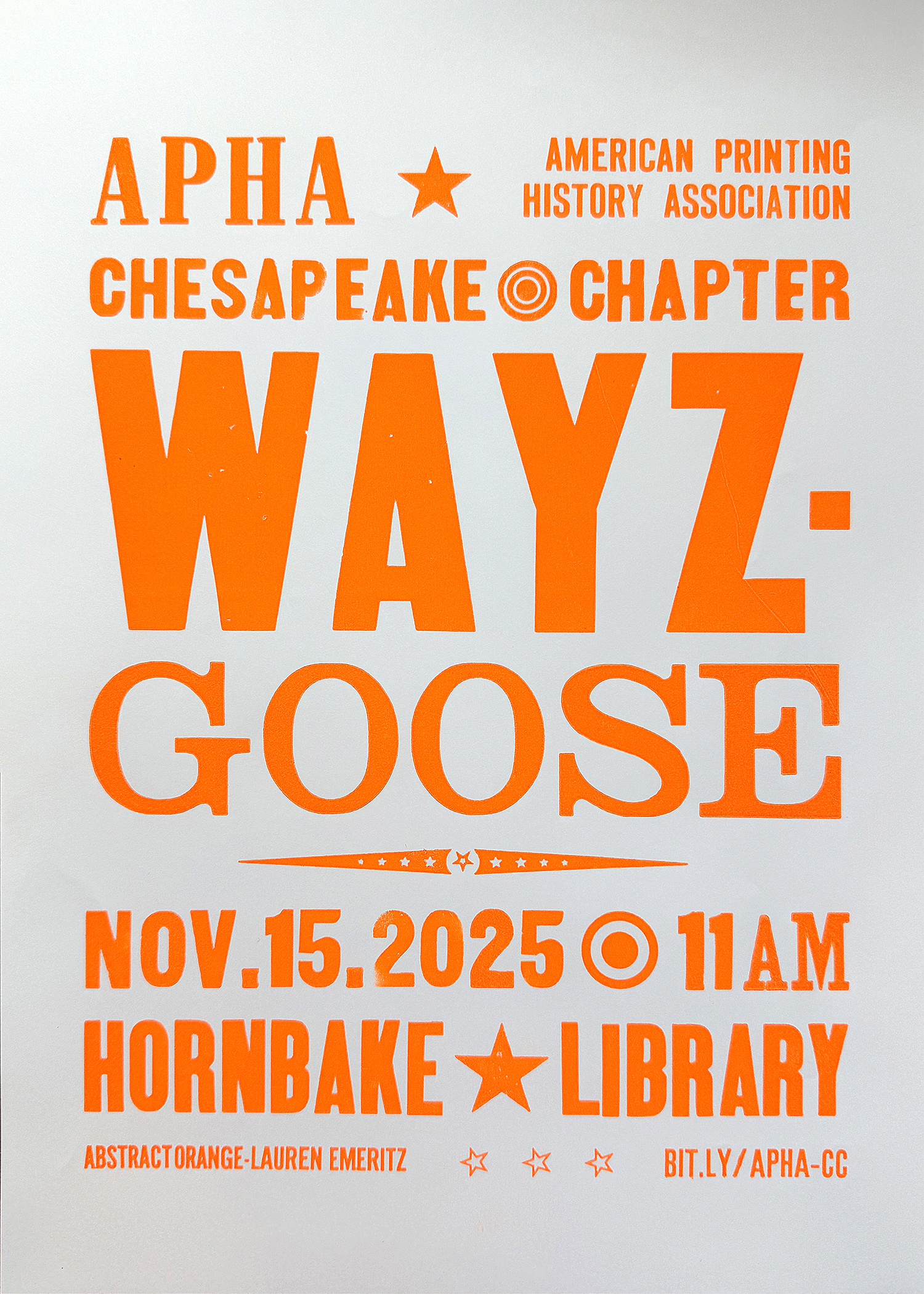 Send a short statement expressing your interest in the history and practice of printing and related arts and what you hope to gain from joining the Chapter’s diverse community. The deadline to apply is November 15th. Send your statement (or any questions) to the Chapter Secretary (ChesapeakeAPHA@gmail.com) with the subject “Denker Fellowship Application.”